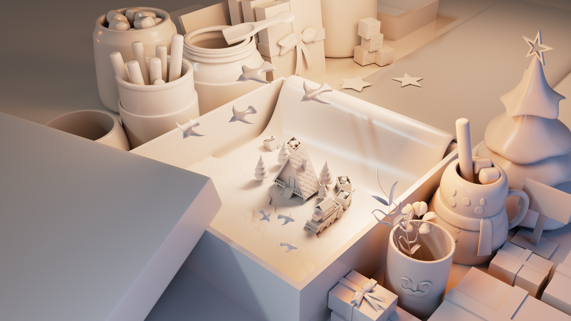 Before moving on to texturing, I did a lighting test to set the overall mood of the scene before I start texturing. I started by placing a sky dome to light the environment, then adjusted the main light’s angle and color temperature to create a warm, inviting atmosphere.